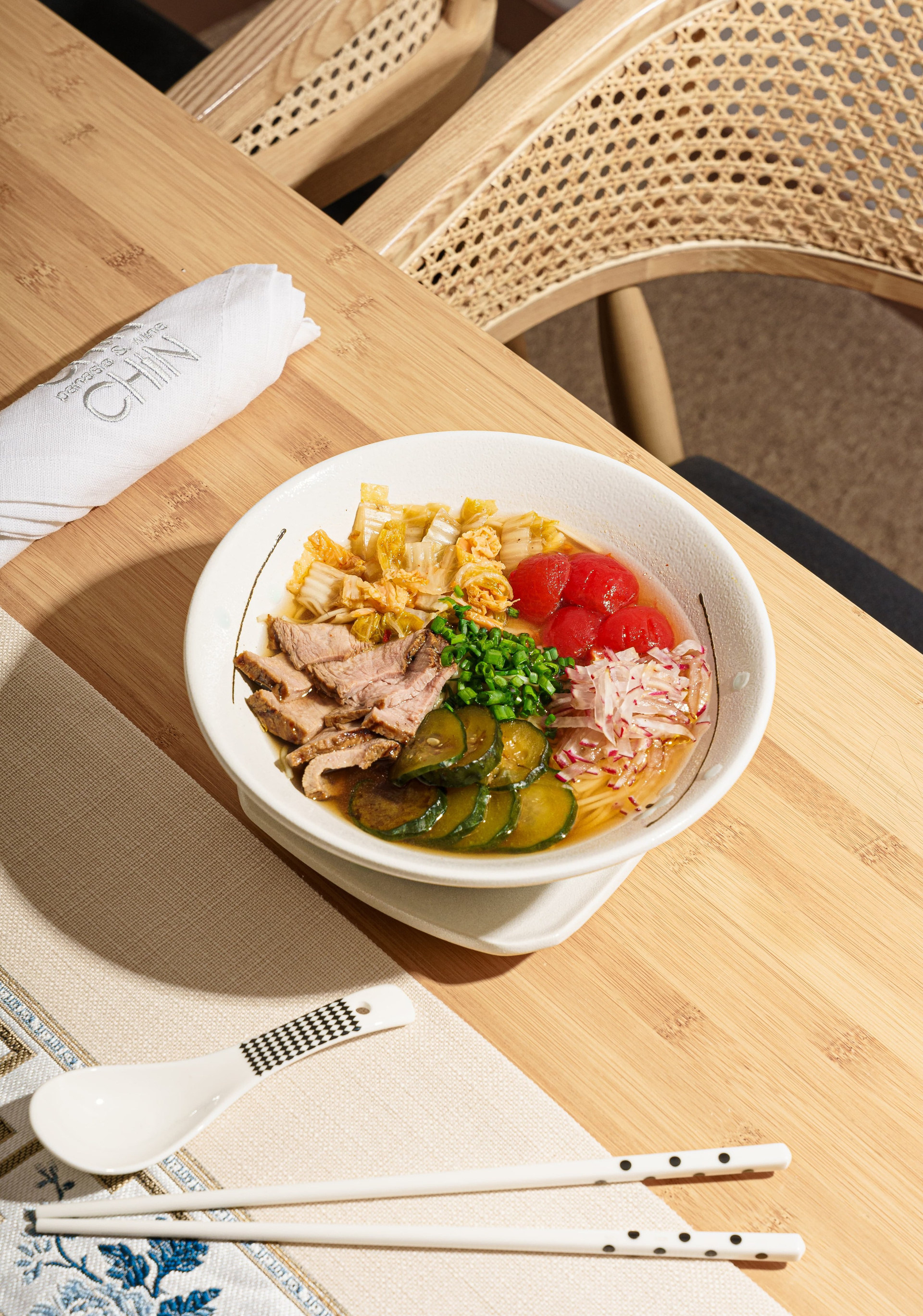 Классический японский рамен с яйцом, зеленью и кунжутом в насыщенном бульоне.